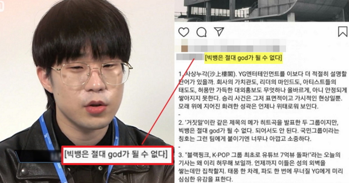 지난 9일 정종원은 자신의 인스타그램 계정에 YG 건물 사진과 함께 "빅뱅은 절대 god가 될 수 없다"로 시작하는 장문의 글을 게재했다.