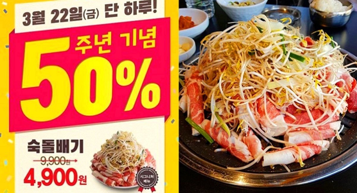 더본코리아에 따르면 1인분에 9,900원인 돌배기집 숙돌배기는 오는 22일 단 하루만 4,900원에 판매된다.