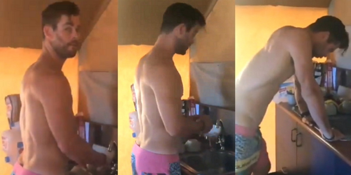 크리스 헴스워스는 상의를 탈의한 채 열심히 그릇을 헹구고 있다. 시선을 잡아 끈 건 그의 탄탄한 근육질 몸매다.