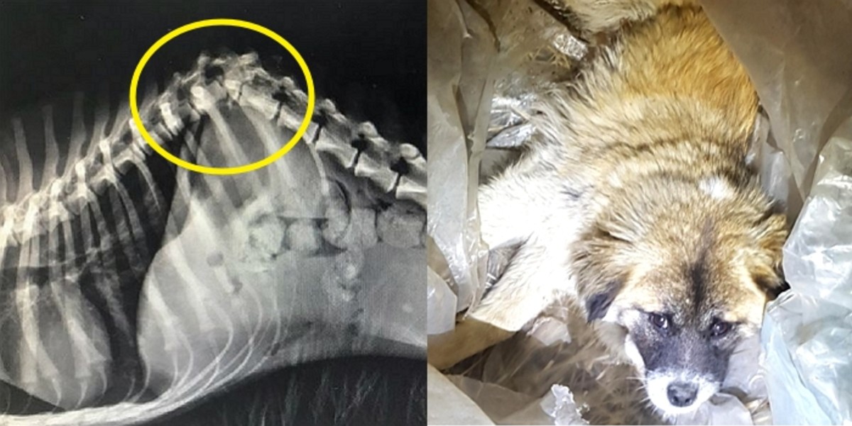주차장 주변 밭에 버려진 폐비닐 속에 있던 유기견은 척추가 완전히 부러져 움직이지 못하는 상태였다.