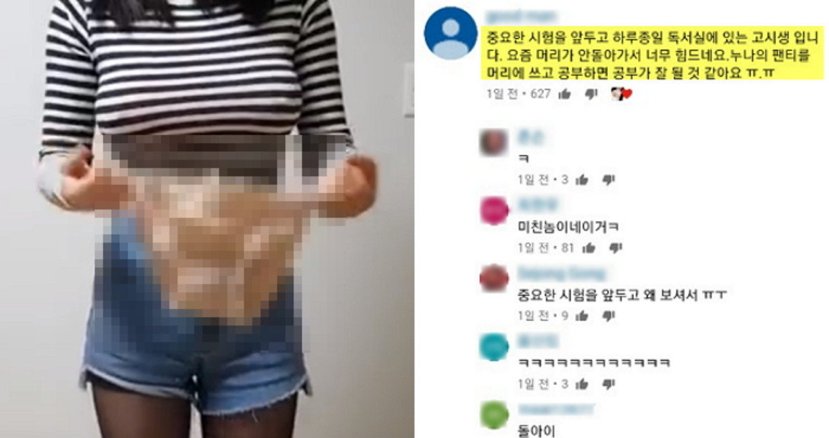 [인사이트] 함철민 기자 = '좋아요'와 '구독'을 누르면 자기가 입던 팬티를 준다는 유튜브 영상에 한 수험생이 남긴 웃픈(?) 댓글이 누리꾼들의 시선을 끌었다.
