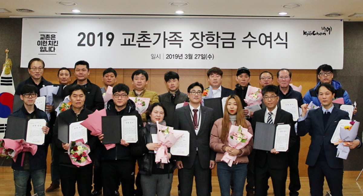 지난 27일 교촌에프앤비 본사에서 진행된 '2019 교촌가족 장학금 수여식'을 통해 교촌치킨은 가맹점주와 지사 직원 61명에게 총 3,050만원의 장학금을 전달했다.