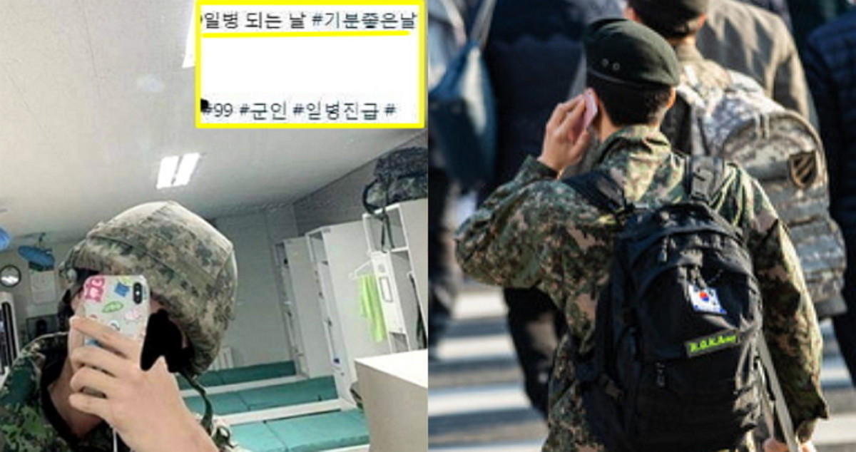 공개된 사진 속 인스타그램에는 "일병 되는 날, 기분 좋은 날"이라는 글이 함께 게재돼 있다. 사진 속 부대 내 생활관에서 얼굴을 가린 채 거울 앞 셀카를 찍고 있다.