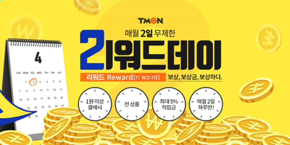 [인사이트] 이하린 기자 = 티몬은 매월 2일을 '리워드데이'로 지정하고 전 상품 한도 제한 없이 구매 금액의 1% 또는 5%를 적립금으로 돌려주는 이벤트를 실시한다고 밝혔다.
