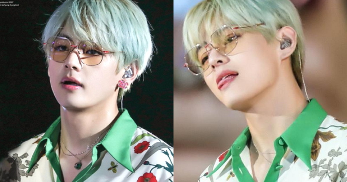 이날 뷔는 멜론을 연상케하는 연두색 머리에 플라워 프린팅의 상의, 그리고 컬러가 입혀진 안경을 쓰고 무대에 등장했다.