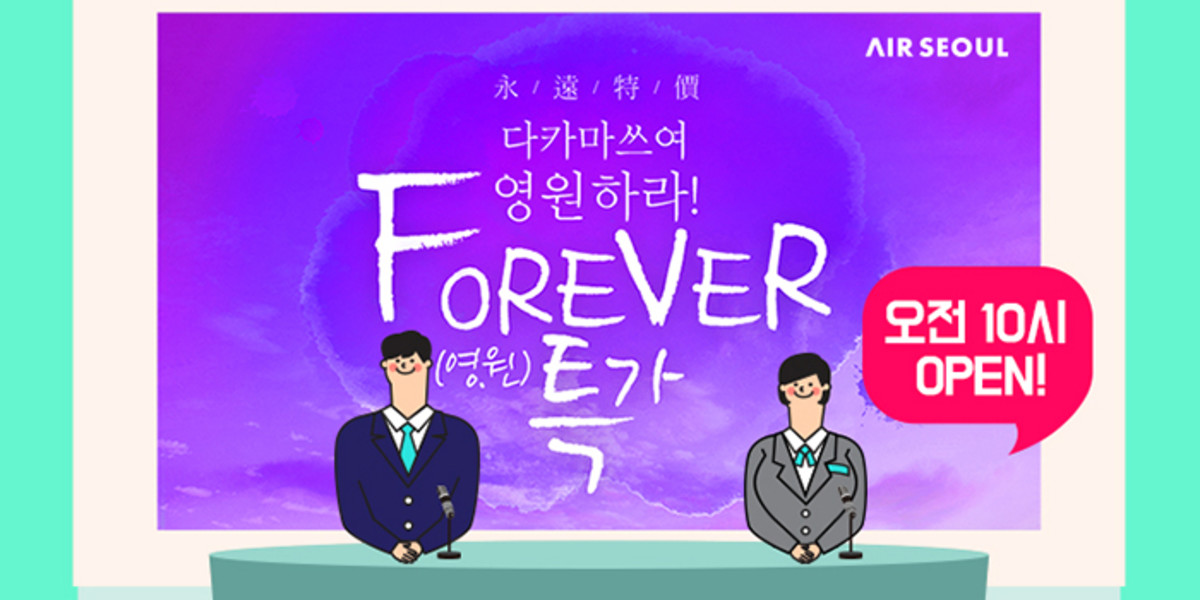 탑승기간은 4월 10일부터 7월 31일까지며, 에어서울 홈페이지 회원에 한하여, 4월 9일 오전 10시부터 4월 15일까지 선착순으로 '영원 특가' 항공권을 구매할 수 있다.