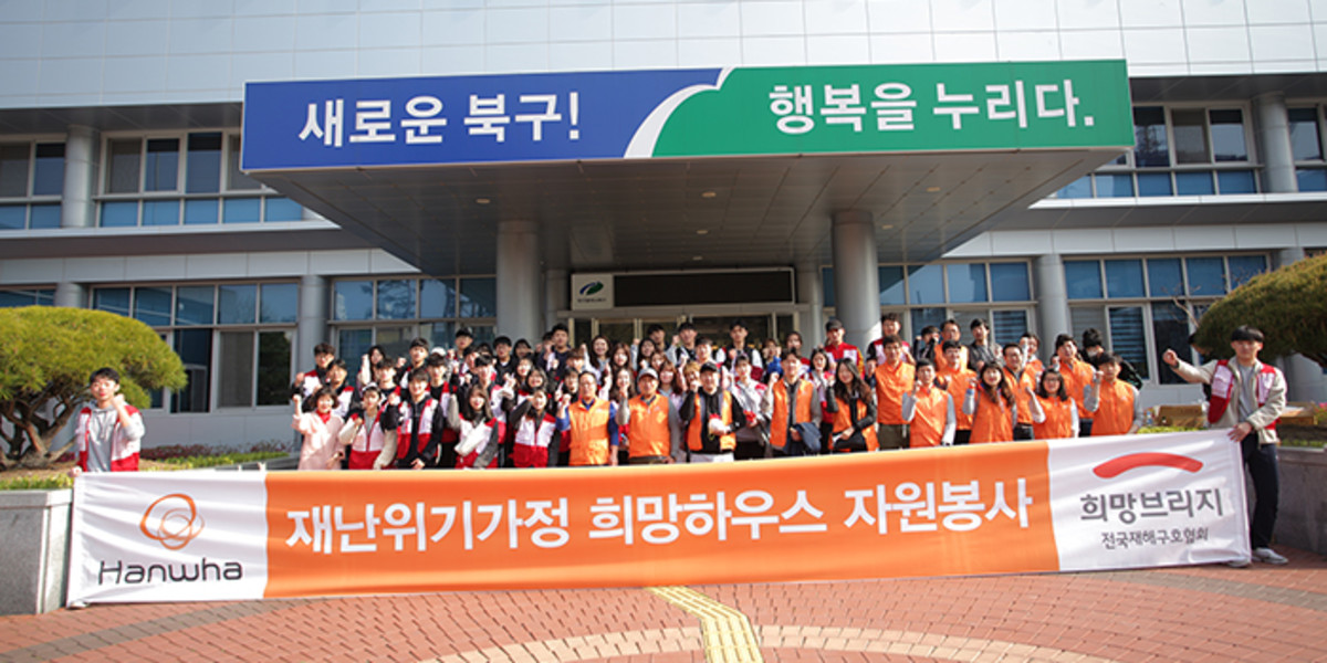 한화손해보험은 지난 2015년부터 희망브리지 전국재해구호협회와 함께 지방권역에서는 '재난 위기가정 환경개선' 활동을, 서울특별시에서는 '화재피해가정 지원사업'으로 지역의 생활안전망을 구축하기 위해 임직원 참여 봉사 프로그램을 운영하고 있다.