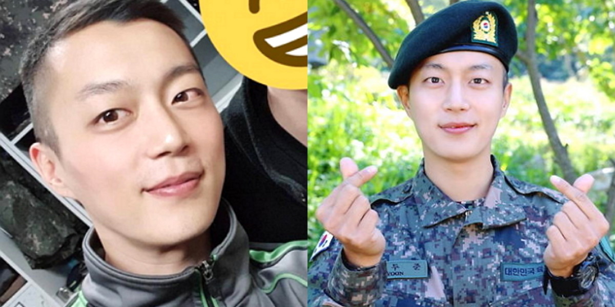 공개된 사진 속 윤두준은 짧게 깎은 머리를 하고 생활복을 입은 뒤 군인다운 자태를 뽐내고 있다.