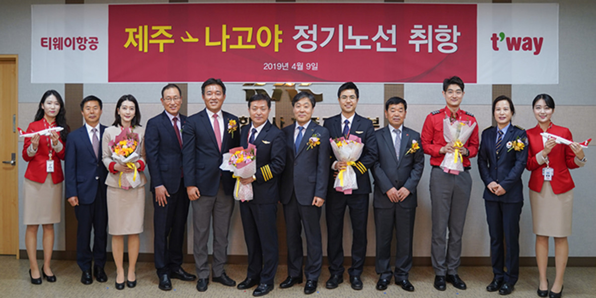 티웨이항공은 제주-나고야 신규 취항을 기념해 9일 오후 제주국제공항에서 김수봉 한국공항공사 제주지역본부장, 김형이 티웨이항공 경영본부장 등 관계자들이 참석한 가운데 취항식 행사를 진행했다.