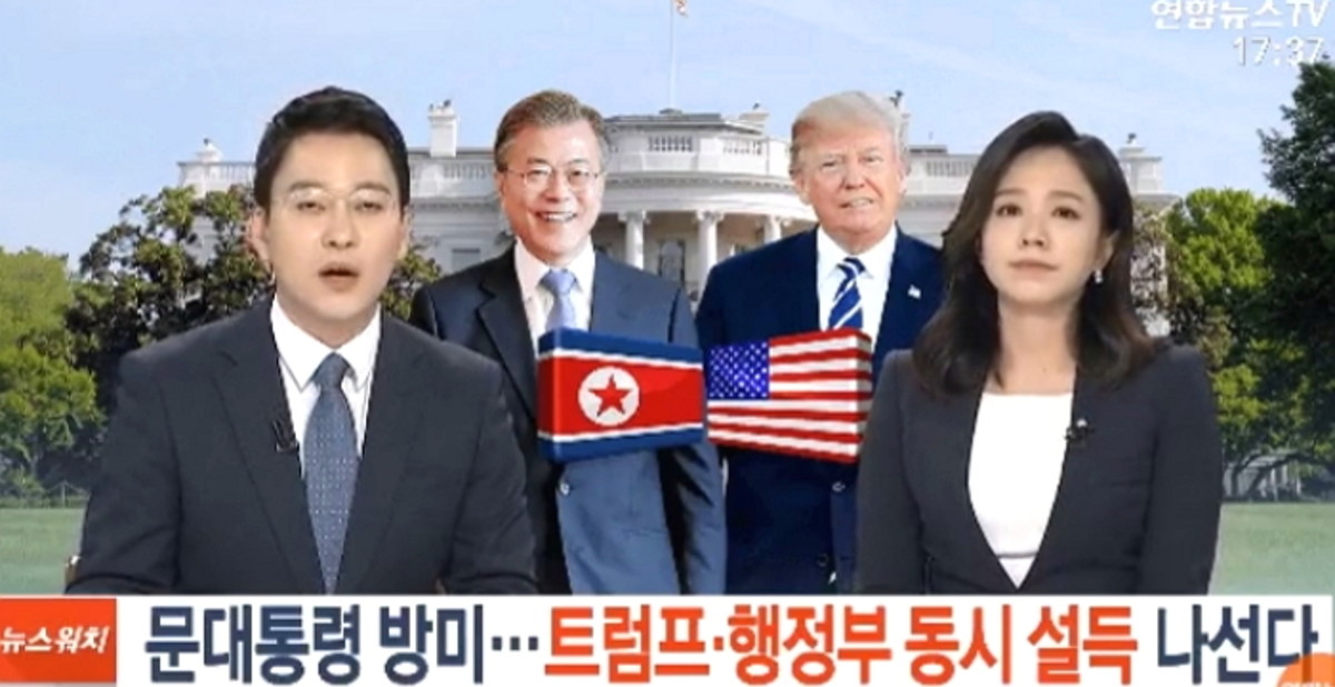 지난 10일 연합뉴스TV '뉴스워치'는 "문 대통령 방미···트럼프·행정부 동시 설득 나선다"는 제목의 뉴스를 보도했다.