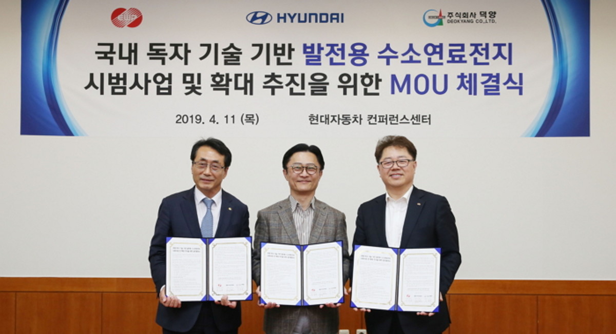 11일 현대자동차와 한국동서발전, 덕양은 현대자동차 양재 사옥에서 현대자동차 전략기술본부 지영조 사장, 한국동서발전 박일준 사장, 덕양 이치윤 회장 등이 참석한 가운데 '수소연료전지 발전 시범사업 양해각서(MOU)'를 체결했다고 밝혔다.