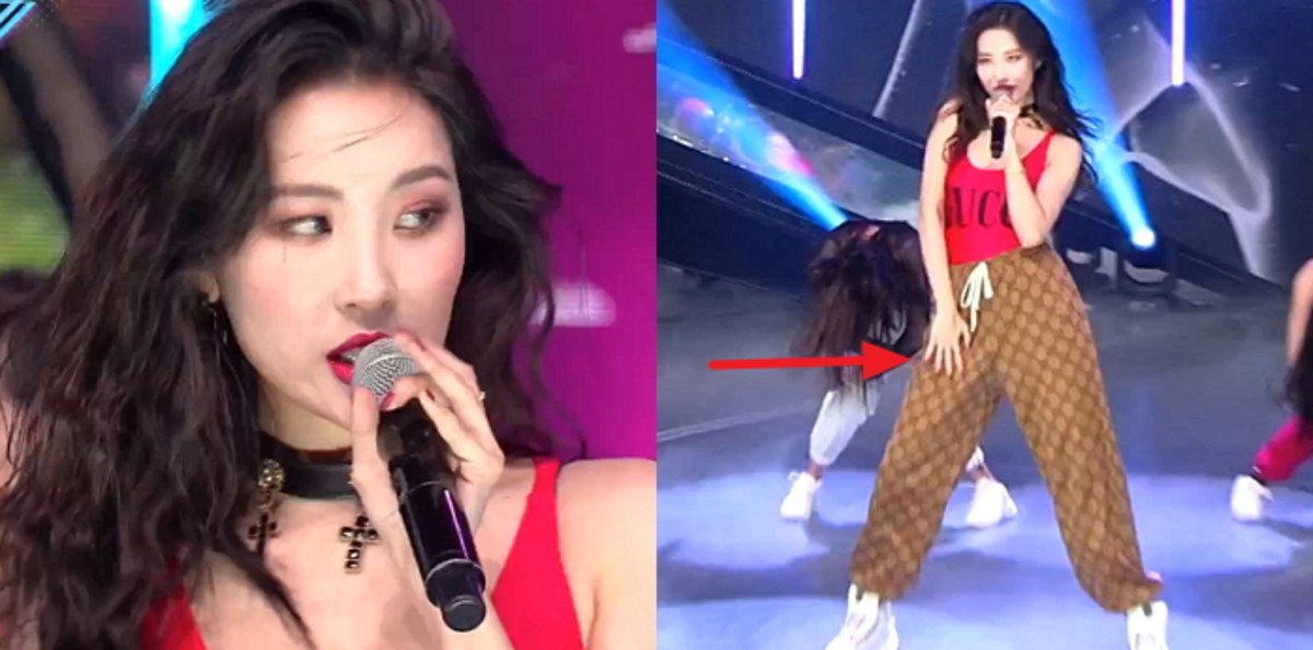 자작곡인 '거기 너' 무대 때 선미는 빨간색 구찌 수영복 상의에 '몸빼 바지'처럼 보이는 갈색 바지를 입고 등장해 스웨그 넘치는 춤을 선보였다.