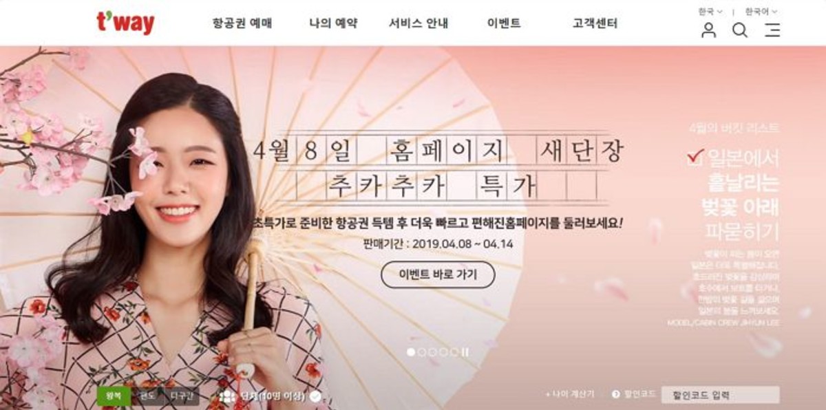 티웨이항공은 홈페이지 개편을 기념해 5월말 탑승편까지 이용 가능한 '홈페이지 새단장 특가 이벤트'를 오는 14일까지 진행한다.