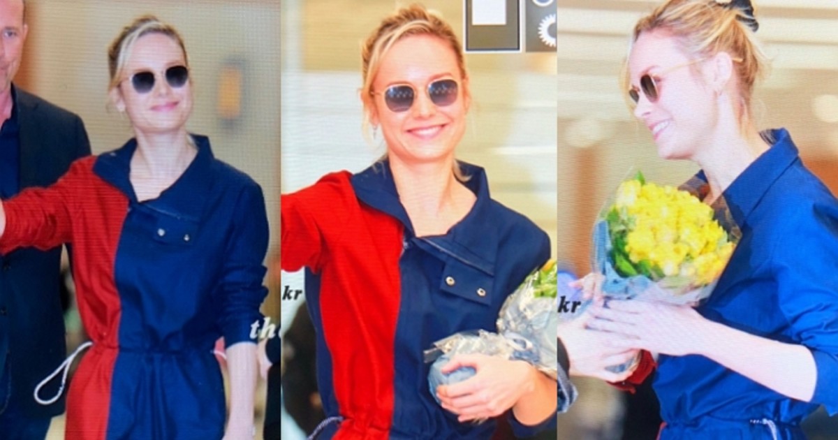 브리 라슨은 오랜 비행에도 여유로운 표정과 환한 얼굴이 눈에 띄는 모습이다.