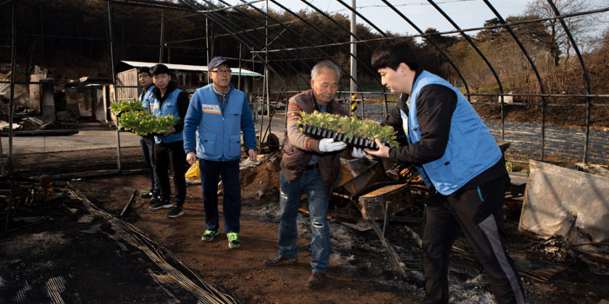 봉사지역은 강원 지역 산불로 15,000㎡ 규모의 농지와 집, 농기계 등이 불에 탄 강원도 강릉시 옥계면의 잎담배 농가로, 이날 농가를 방문한 임직원들과 자원봉사자 30여 명은 피해복구 활동과 함께 잎담배 이식 작업을 진행하고 위로금을 전달했다.