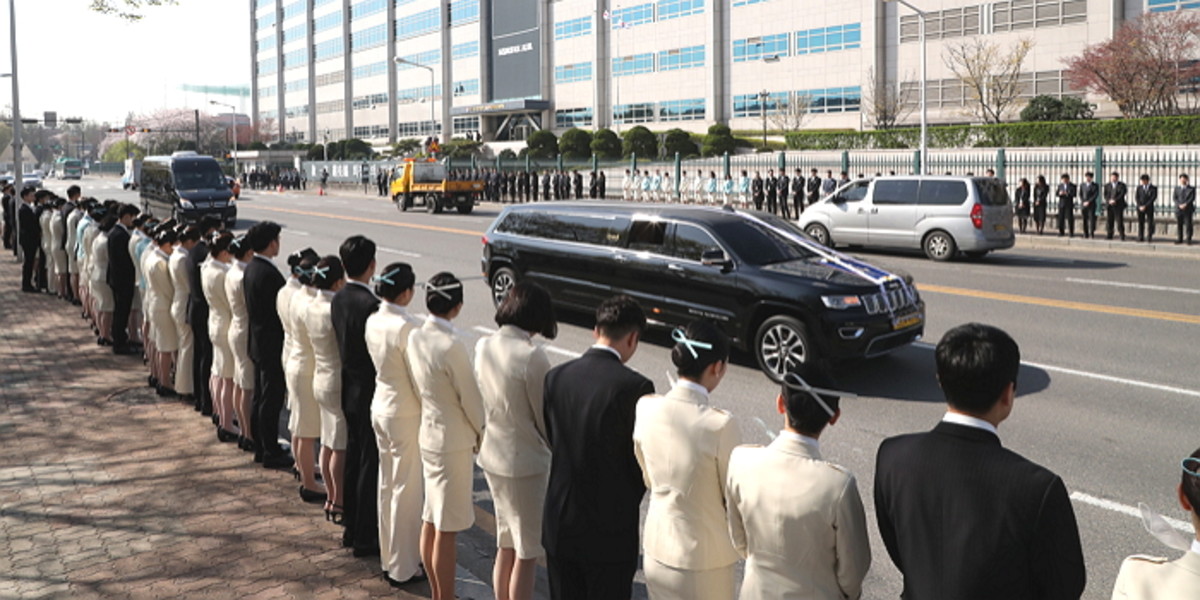 조 회장의 운구차량이 공항동 대한항공 본사를 지날 때 '유니폼'을 입은 대한항공 직원들이 서서 배웅한 것이다.