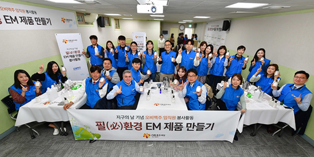 이날 오비맥주 고동우 대표와 장유택 부사장을 포함한 임직원 봉사단 20여 명은 전문강사에게 EM의 원리와 효용, EM이 환경에 미치는 영향, 실생활에서의 EM활용법 등 EM에 관한 교육을 받고 EM용액을 활용해 환경 개선에 효과적인 생활용품을 직접 만들었다.
