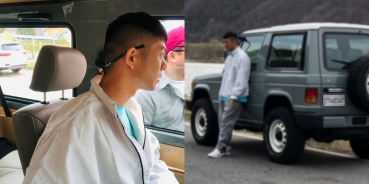 사진 속 빈지노는 편안한 차림을 하고 자동차 안에 앉아 주변 사람들과 어딘가를 응시하고 있다.