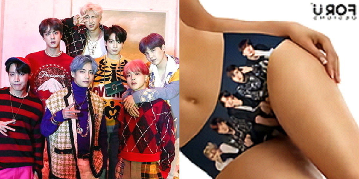 사진을 보면 여성 속옷 모델이 방탄소년단의 단체샷이 프린트된 팬티를 입고 있다.