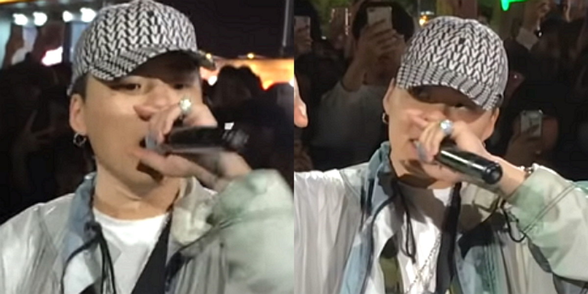 그는 수많은 인파 속에 둘러싸였음에도 긴장한 기색 하나 없이 카리스마 넘치는 래핑을 선보였다.