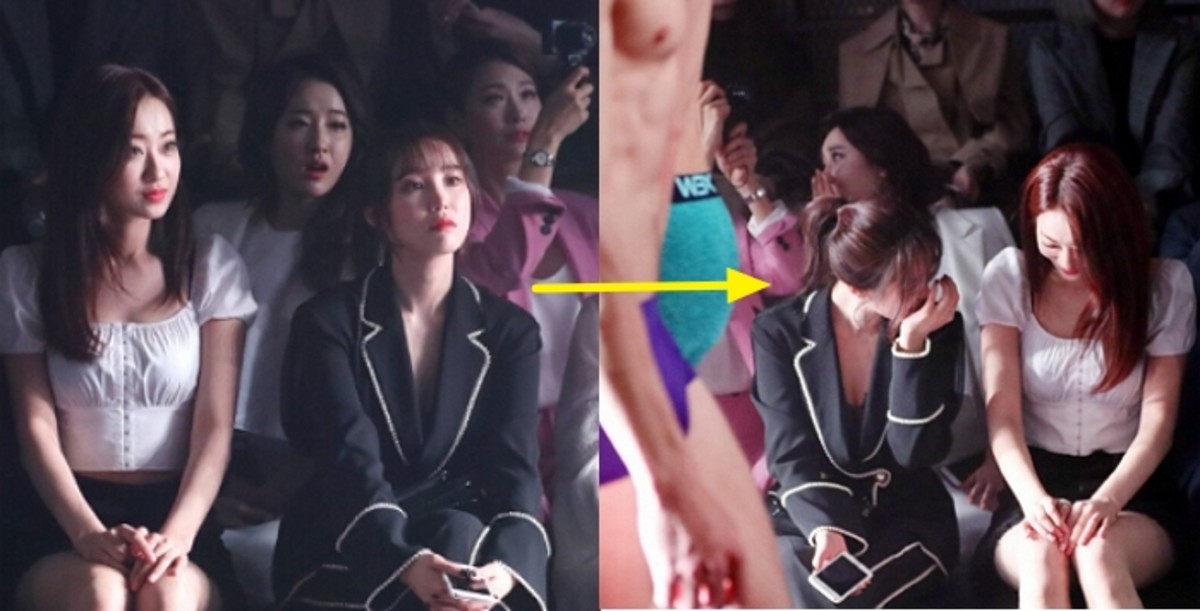이어 경리와 전효성은 서로 마주 보며 웃다가 남성 모델이 지나가자 다시 패션쇼를 집중해서 관람하는 모습을 보였다.