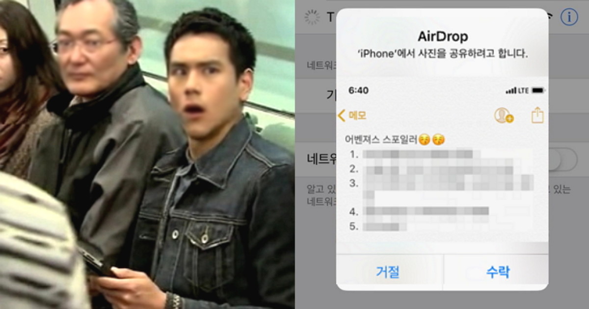 어벤져스를 미리 본 한 승객이 수락하지 않아도 아이폰 기기 끼리 이미지를 교환할 수 있는 '에어드롭'을 이용해 스포일러 한 것이다.