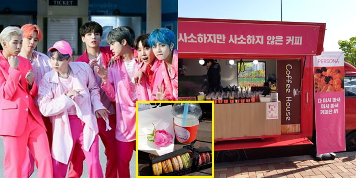 방탄소년단이 준비한 선물은 커피차와 마카롱, 포토카드, 손글씨 스티커 등이었다.