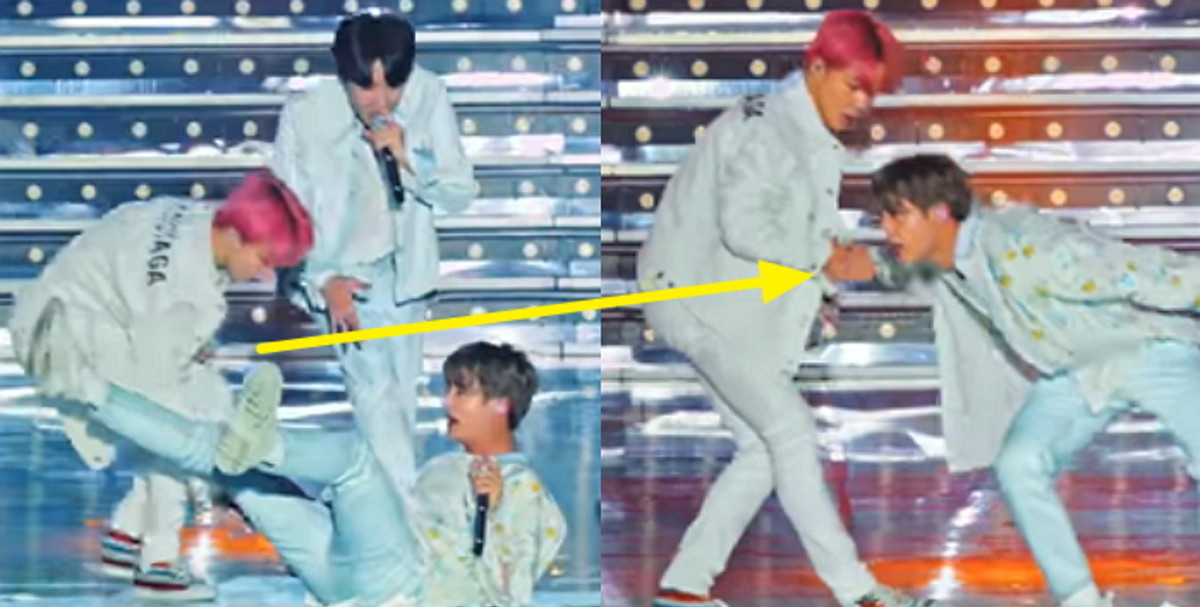 뒤에 있던 제이홉은 진의 어깨를 두드리며 그를 걱정했고, 옆에서 춤을 추던 뷔도 걱정스러운 눈빛으로 그를 바라봤다.