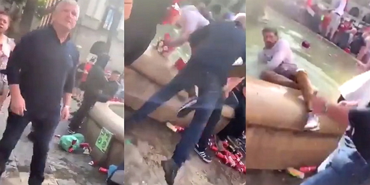 리버풀 팬들의 추태는 이후에도 계속 이어졌다. 이번에는 한 리버풀 팬이 흑인 남성을 들어 올리더니 분수에 밀어버렸다.
