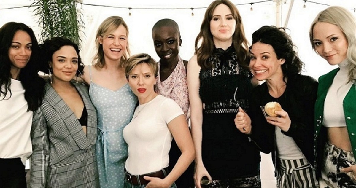 왼쪽부터 가모라(조 샐다나), 발키리(케사 톰슨), 캡틴 마블(브리 라슨), 블랙위도우(스칼렛 요한슨), 오코예(다나이 구리라), 네뷸라(카렌 길런), 와스프(에반젤린 릴리), 맨티스(폼 클레멘티에프)까지.