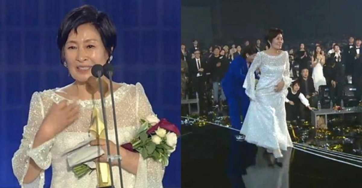 시상식에 참석한 배우들이 모두 일어나 한 마음이 되어 김혜자를 향해 뜨거운 박수를 보냈다.