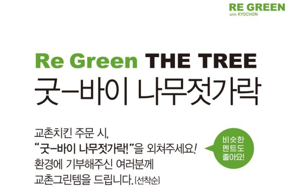 한편, 교촌에프앤비는 지난 2월부터 친환경 캠페인 '리그린 위드교촌'을 대대적으로 시행하고 있다. 교촌치킨 매장 내 및 배달 주문 시 제공되는 일회용품 품목 사용을 차례로 줄여나갈 예정이다.