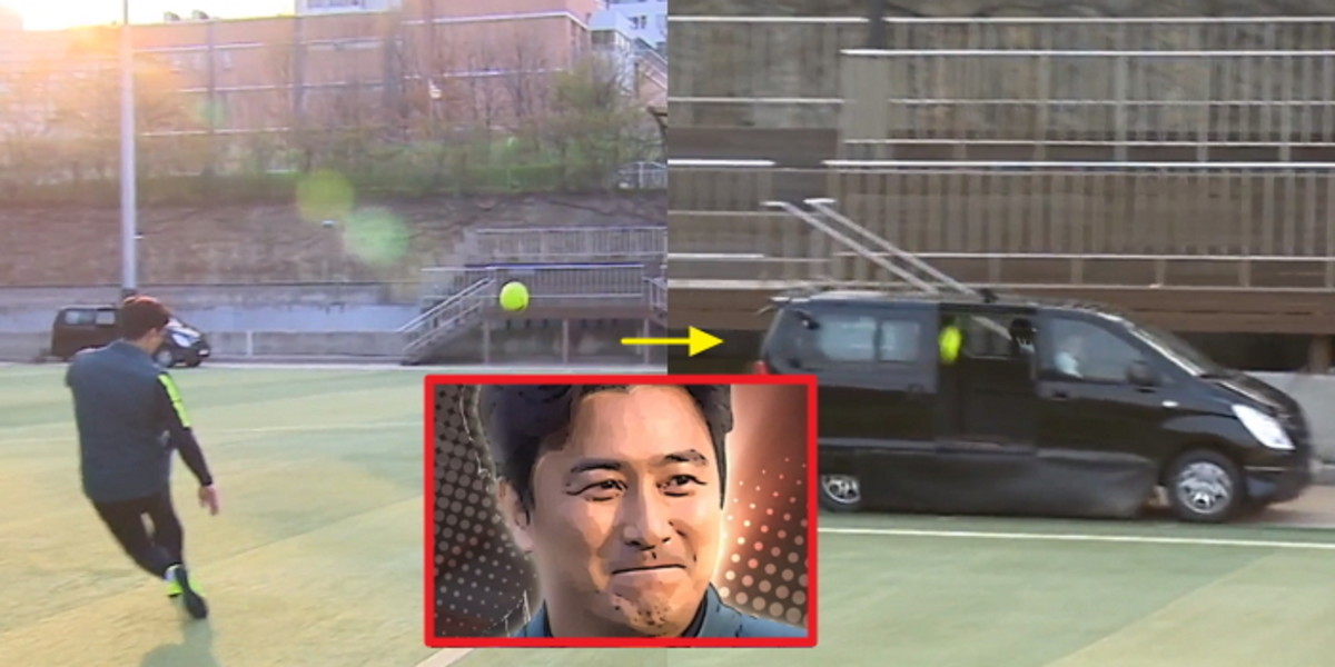먼저 유상철이 기세등등하게 공차기에 도전했다. 그는 운동장에 놓인 공을 오른발로 힘껏 감아 찼다.