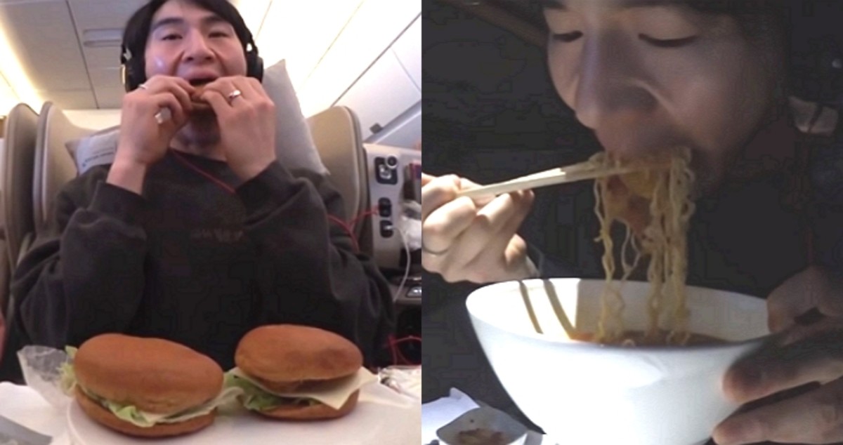 아래는 기내식 먹으려고 신혼여행 갔다는 이야기가 나오고 있는 밴쯔의 폭풍 같은 먹방 영상이다.