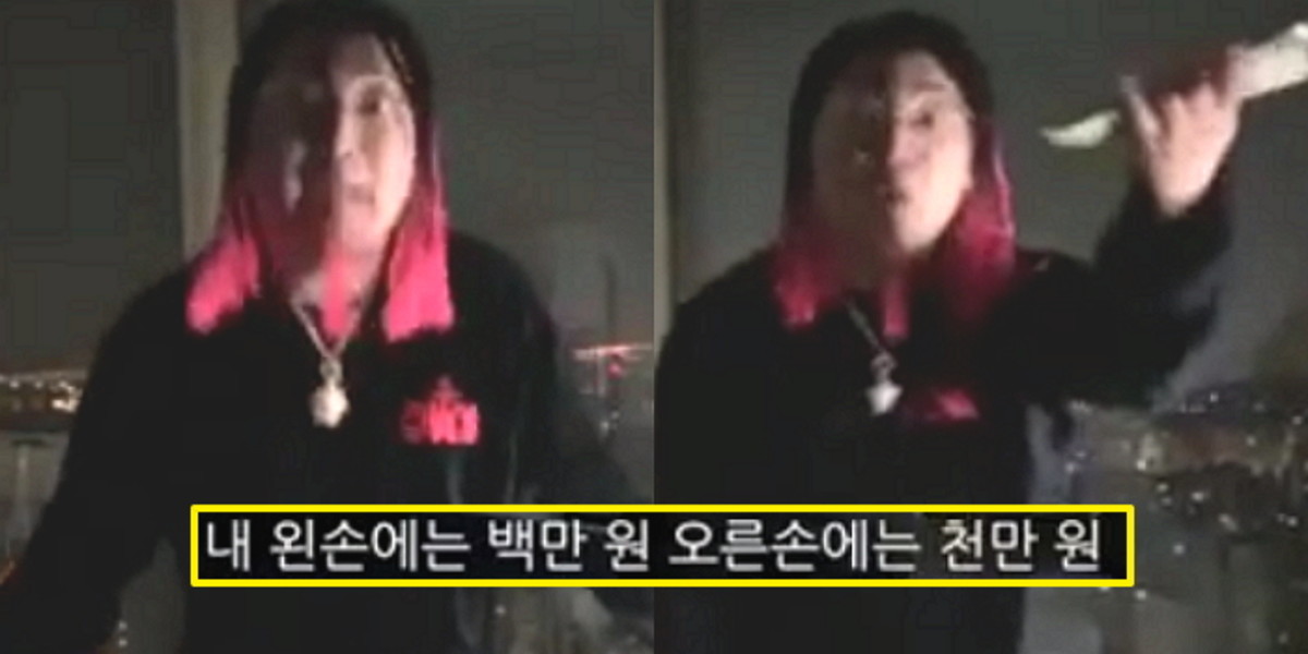 그는 돈뭉치를 양손에 쥐고 "내 왼손에는 백만 원 오른손에는 천만 원"이라는 가사를 반복해서 외쳤다.