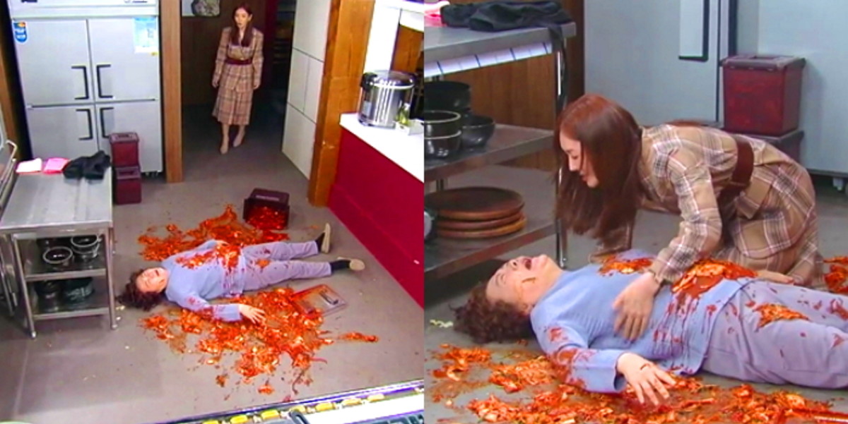 그러나 감정이 상한 박선자가 일을 차근차근 해낼 리 없었다. 박선자는 김치통을 옮기다 넘어졌고, 허리를 삐끗해 김치 위에 제대로 쓰러져 김치 목욕을 했다.