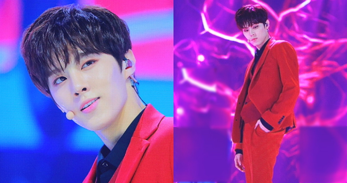 빨간색 슈트 차림으로 등장한 김우석은 엑소의 히트곡 '러브샷'을 완벽에 가깝게 커버했다.