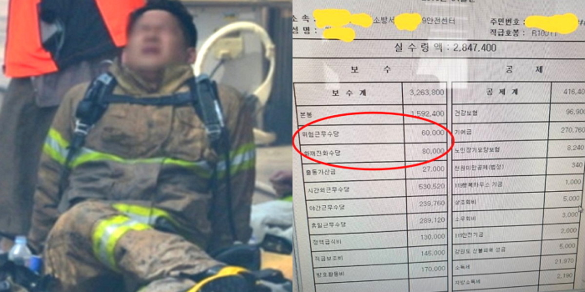 이렇듯 소방관들의 노고에도 '위험근무수당', '화재진화수당' 등 생명, 신체 피해와 관련된 보상 수당은 10만원이 채 되지 않는다.