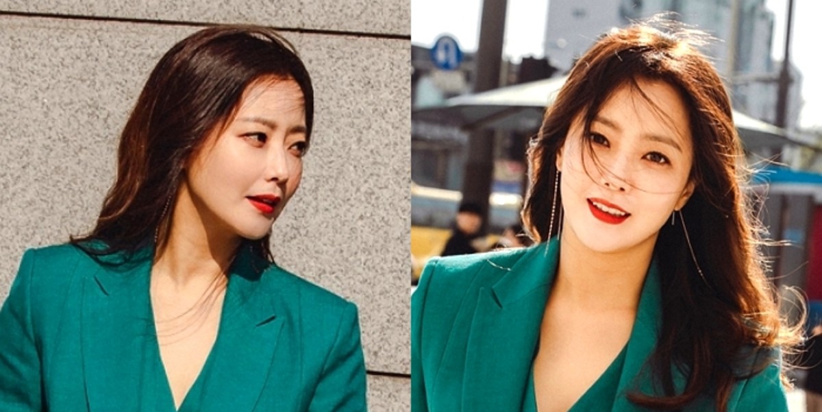 김희선은 그린 컬러 셋업 슈트에 클래식한 디자인의 스퀘어 미니백으로 포인트를 줘 한 폭의 그림 같은 분위기를 만들었다.