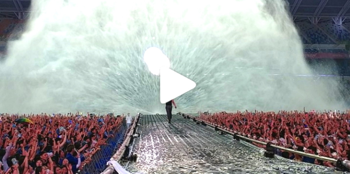엄청난 양의 물이 분사되는 콘서트장에서 싸이는 무대 한가운데를 당당하게 지나고 있다.