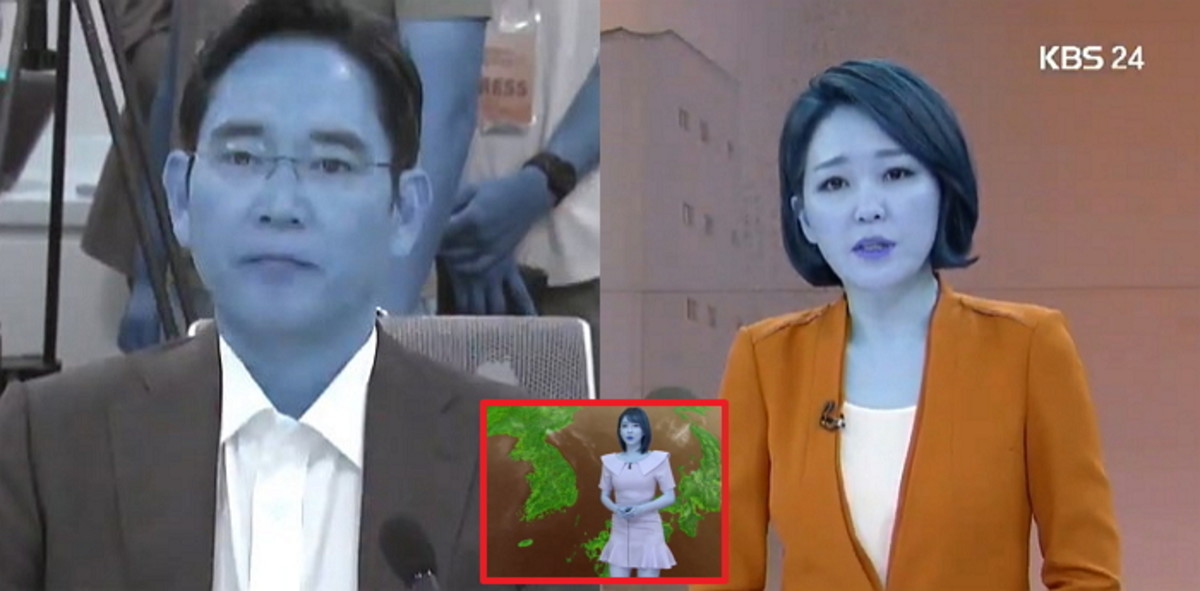 뉴스를 전달하는 앵커를 비롯해 영상 속 모든 인물의 피부색이 본연의 피부색이 아닌 '형광 파랑색'으로 나타난 것. 해당 현상은 색조 처리에 이상이 생겨 나타난 것으로 보인다.