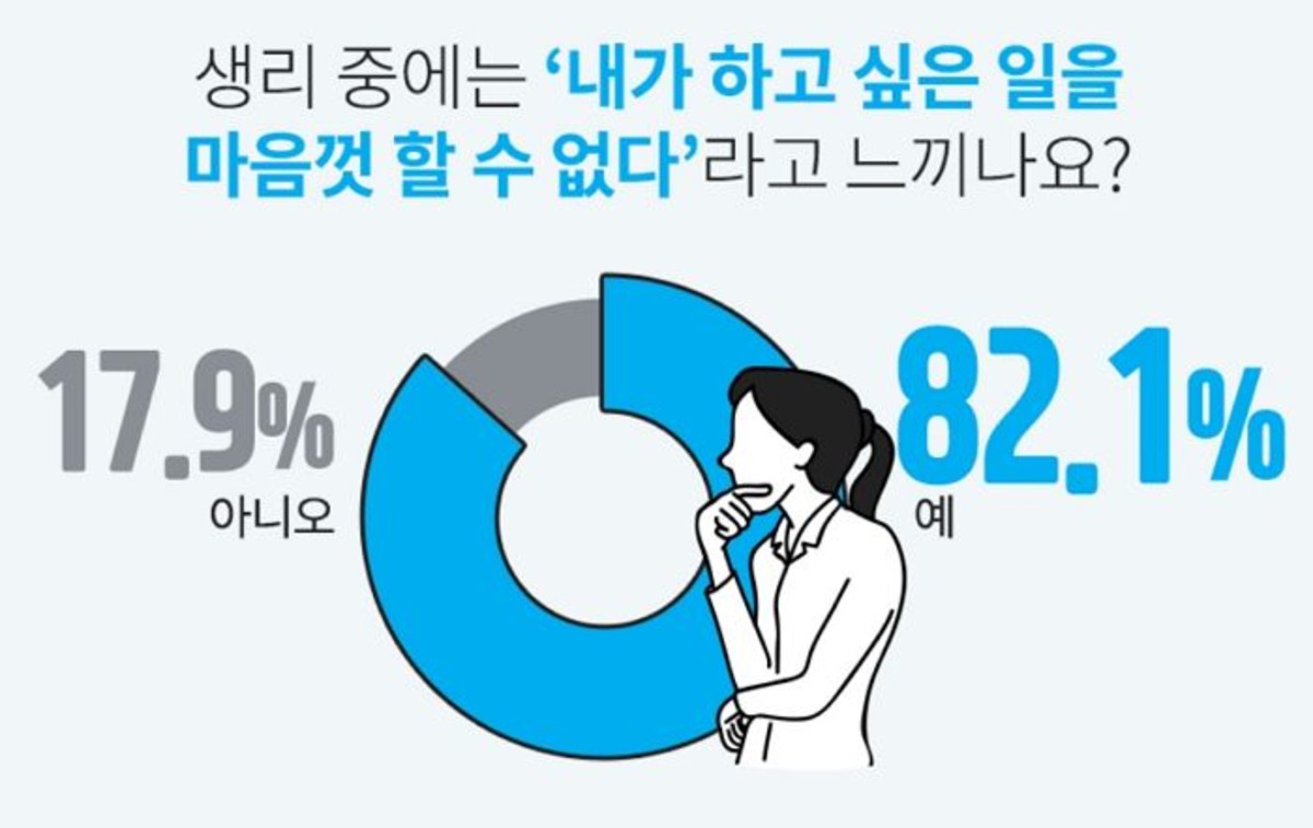 그러나 응답자 중 82%가 생리 중에는 '내가 하고 싶은 일을 마음껏 할 수 없다'고 답해 생리가 나에게 중요하지만 실제 생리로 인해 받는 제약이 매우 큰 것으로 나타났다.