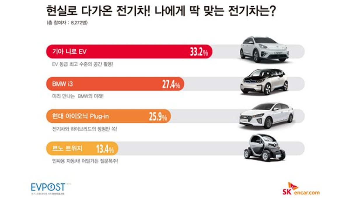SK엔카닷컴이 운영하는 전기차 전문 웹사이트 EV포스트에서 진행한 이번 이벤트에는 총 8,272명이 참가했으며, 이중 기아 니로를 선택한 참가자가 2,789명으로 가장 많았다.