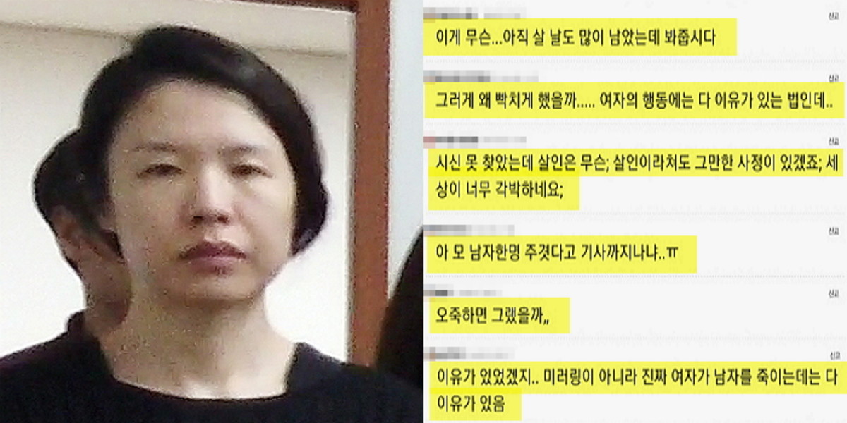 한 여성은 "정말 사랑했었나보다"라고 했으며 또 다른 여성은 "여자가 남편을 살해했다면 이유가 있을 것"이라며 '중립기어'를 꽉 채워놔야 한다고 강조하기도 했다.