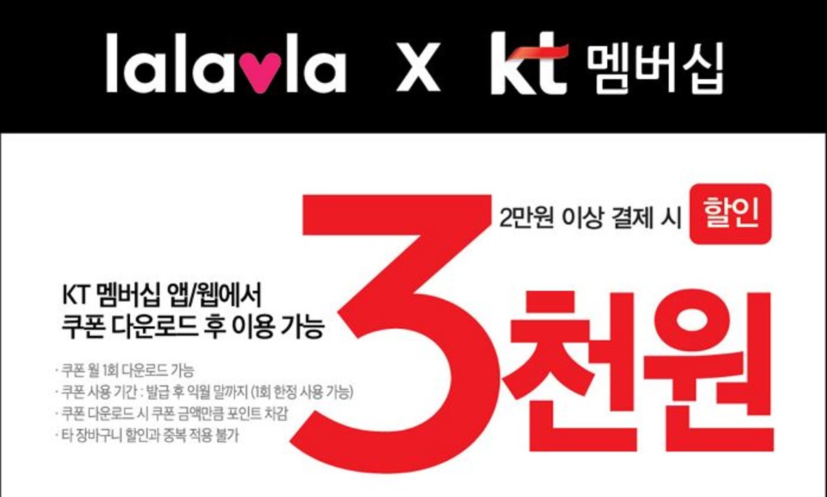 랄라블라를 이용하는 KT 멤버십 회원이라면 2만원 이상 결제 시 3천원 현장할인(월 1회 가능, 통신사 포인트 차감 방식, 월 2만장 선착순)을 받을 수 있게 됐다.