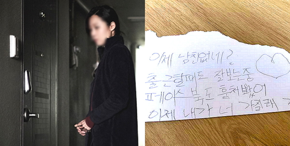 실제로 A씨가 공개한 쪽지에는 "이제 남친 없네? 출근할 때도 잘 보는 중♥ 페이스북도 훔쳐봤어. 이제 내가 너 가질래. 기다려"라는 내용이 담겨있다.