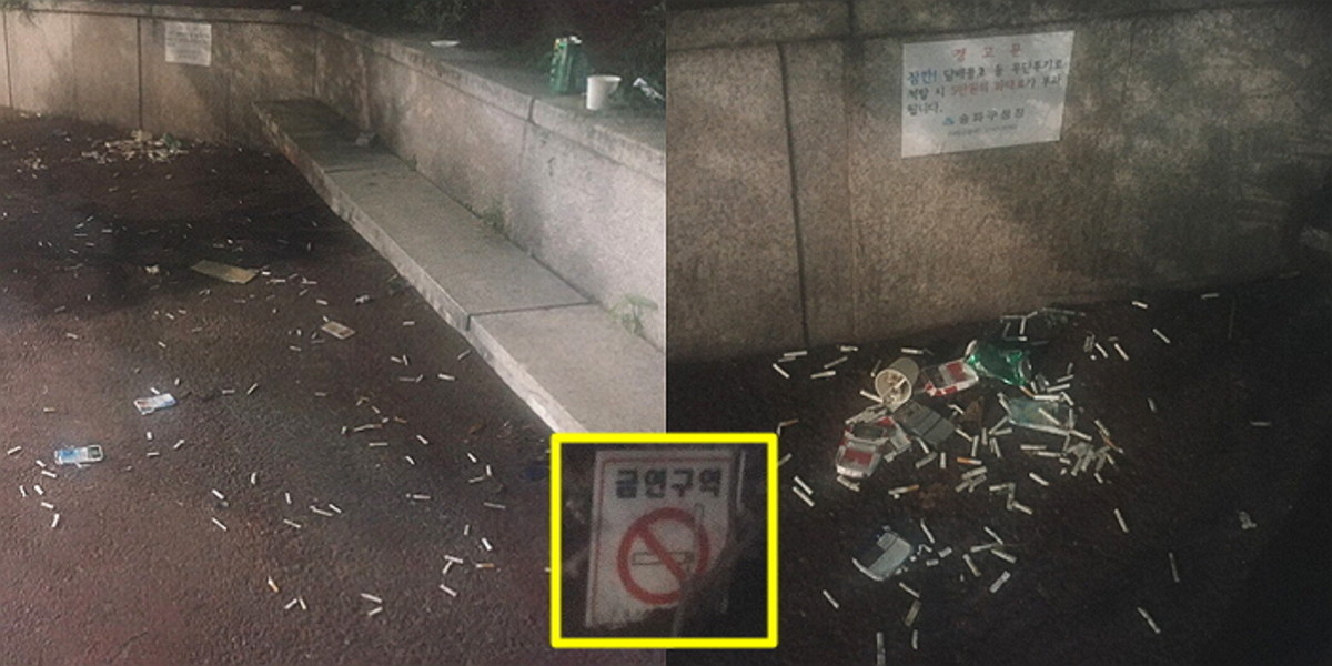 담배꽁초와 함께 일반 쓰레기도 버려져 있어 마치 거대한 쓰레기장을 방불케 한다.