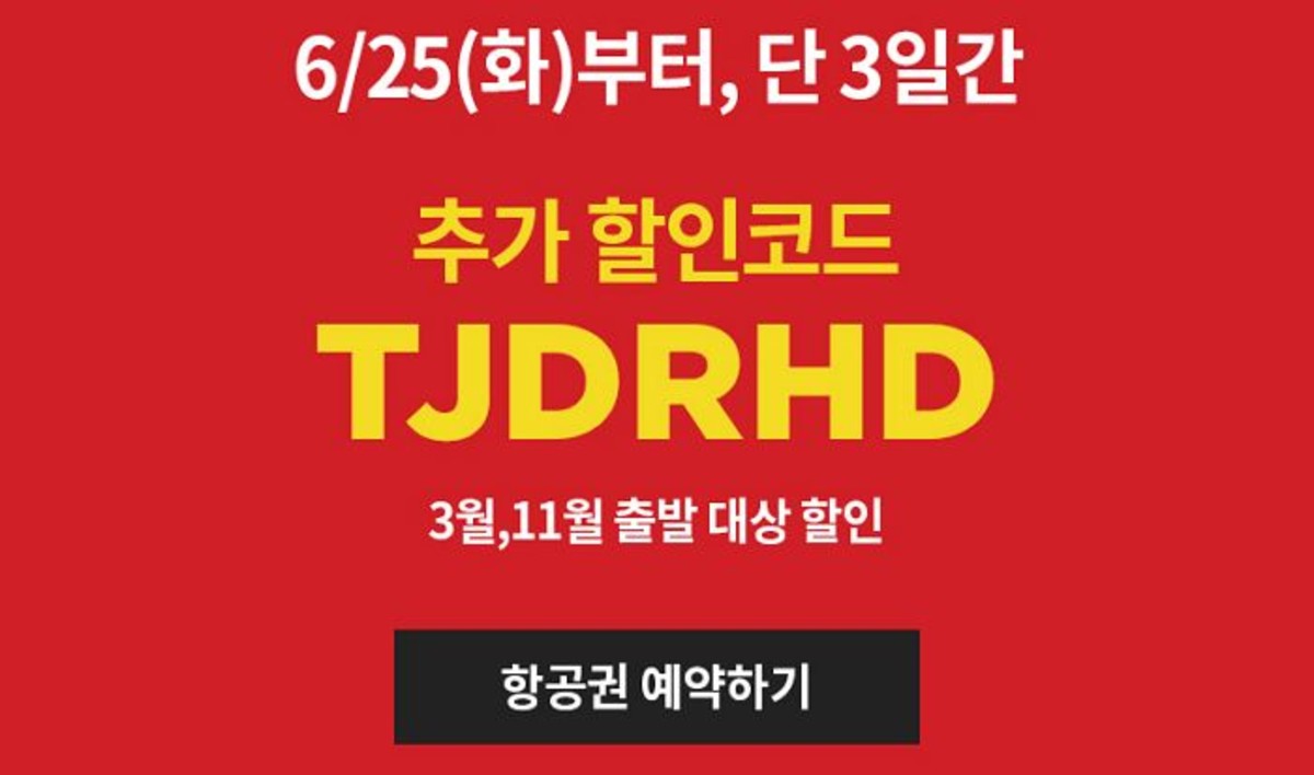 이스타항공은 오늘(25일) 10시부터 레드페스타 이벤트 종료를 앞두고 5% 특별 추가 할인 코드(TJDRHD)를 발급한다.