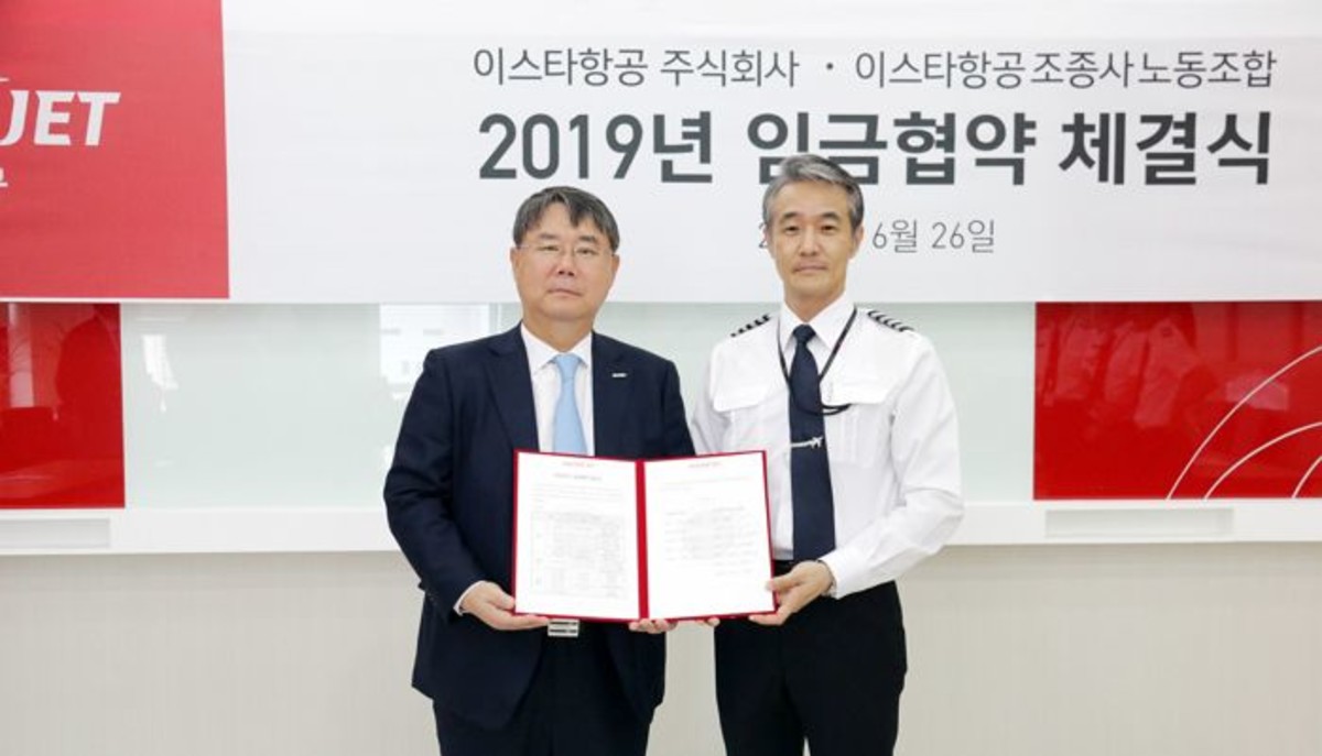 [인사이트] 김한솔 기자 = 이스타항공이 지난 26일 이스타항공 조종사노동조합과 2019 임금협약 체결식을 진행했다고 27일 밝혔다.