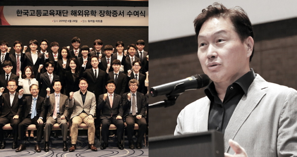 최태원 SK 회장은 한국고등교육재단 지원으로 해외유학을 떠나는 장학생들을 격려하는 오찬 행사에서 각자의 성취를 사회와 공유하는 인재로 성장해 달라고 당부했다.